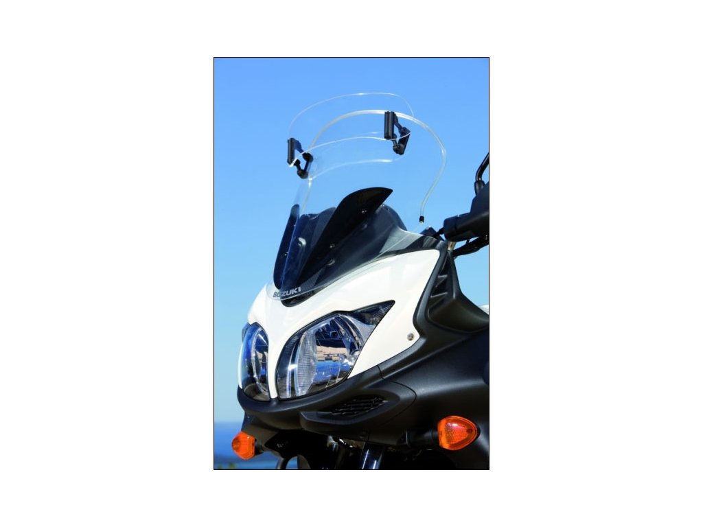 Turistický plexištít s logem Suzuki, čirý. 7-polohový spoiler výrazně redukuje nápor větru a umožňuje individuální nastavení pro různě vysoké jezdce.Balení obsahuje všechny montážní prvky a návod k montáži.